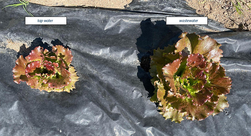 Soil tests were conducted with Lactuca sativa (L.) plants; the tests demonstrated that plants watered with the wastewater actually grew very well, much better than those watered with the same tap water used to produce the wastewater (control). Indeed, the total fresh weight of leaves and roots, and the size of roots and rosettes were significantly greater, as shown in the image below.