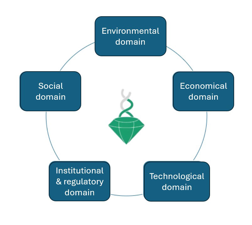 This line of activity has developed an integrated methodological path aimed at the socio-economic evaluation of the upcycling supply chain of textile microfibers into nanodiamonds, taking as a reference the five interconnected domains of sustainability (economic, social, environmental, technological and institutional, as shown in Figure).
